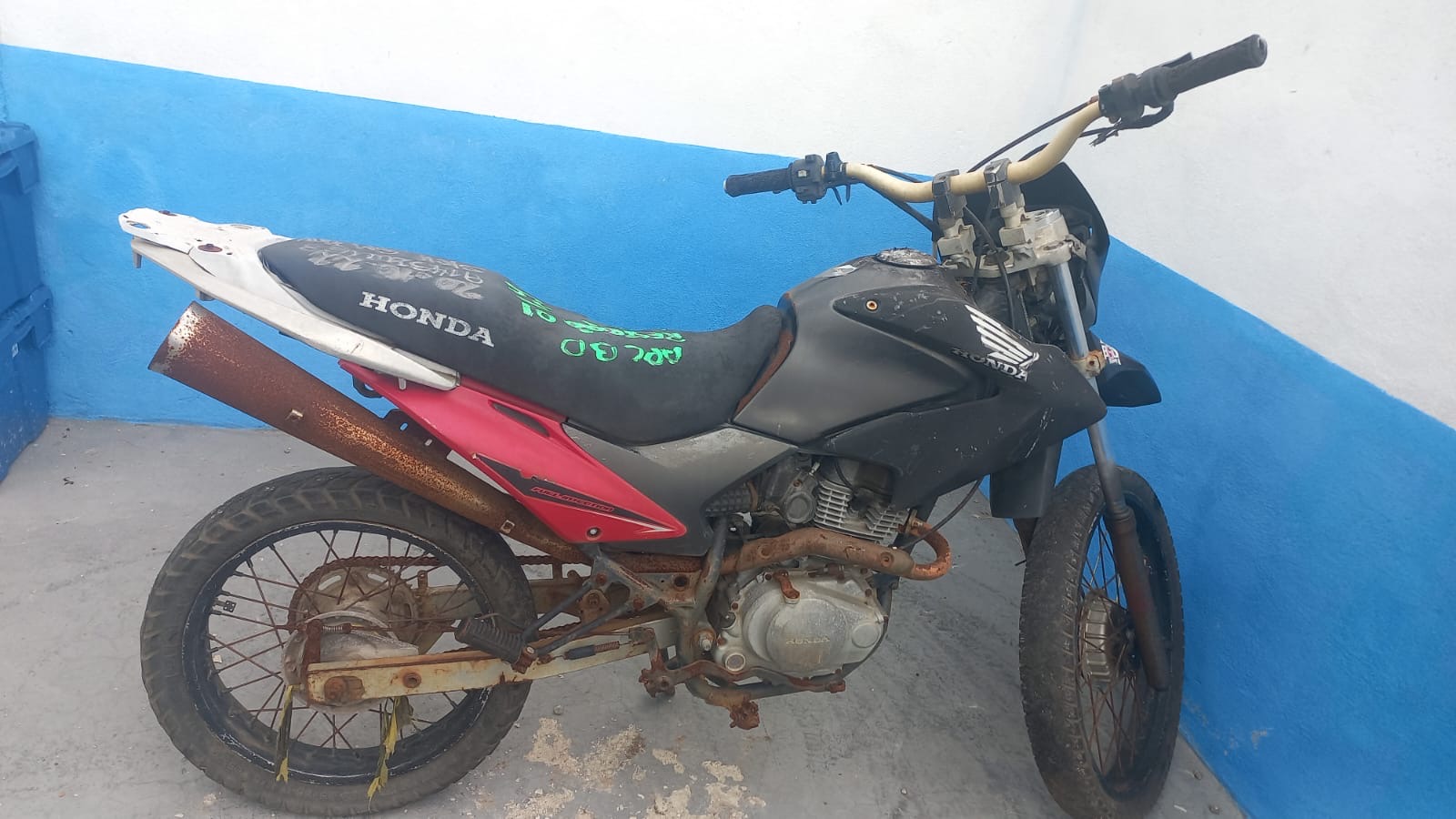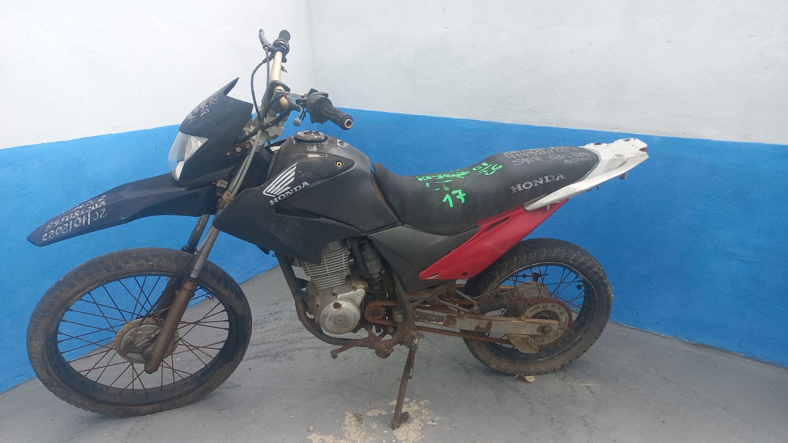 VEÍCULO POSSUI AVARIAS NAS CARENAGENS. PLACA E PAINEL AUSENTES. INICIO DE CORROSÃO NO QUADRO. CHASSI COM INÍCIO DE OXIDAÇÃO. TRATAMENTO E REGULARIZAÇÃO POR CONTA DO ARREMATANTE