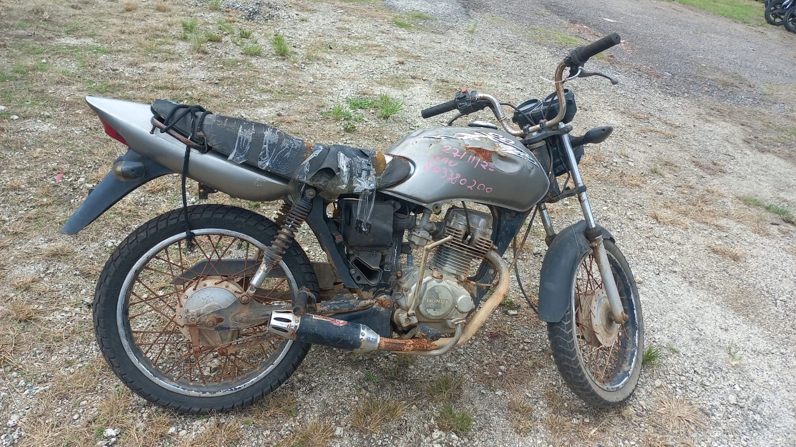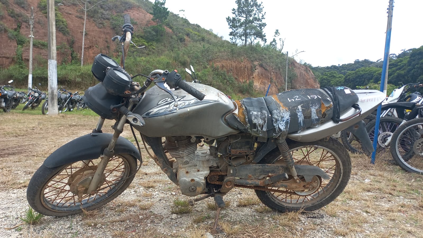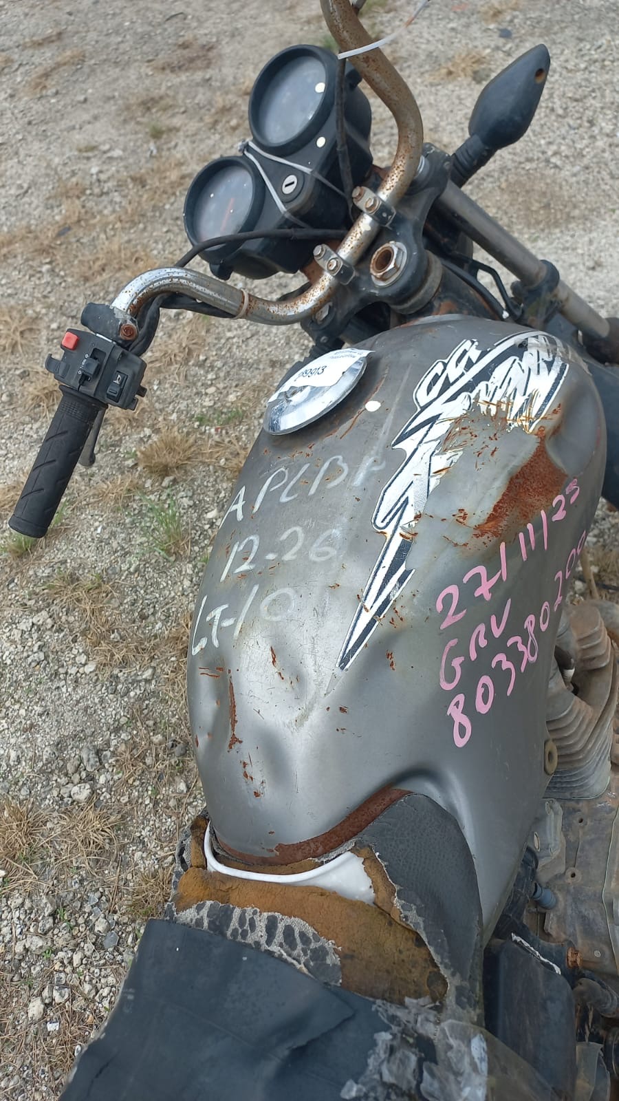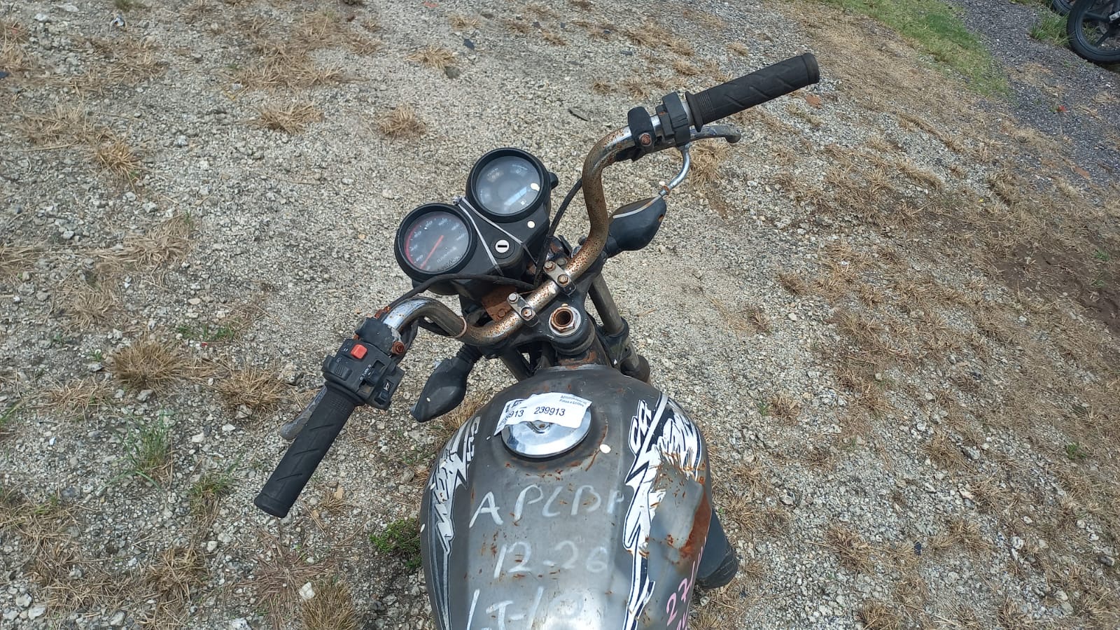 VEÍCULO COM AVARIAS NAS CARENAGENS, BANCO E TANQUE. PLACA E RETROVISORES AUSENTES. REGULARIZAÇÃO POR CONTA DO ARREMATANTE.