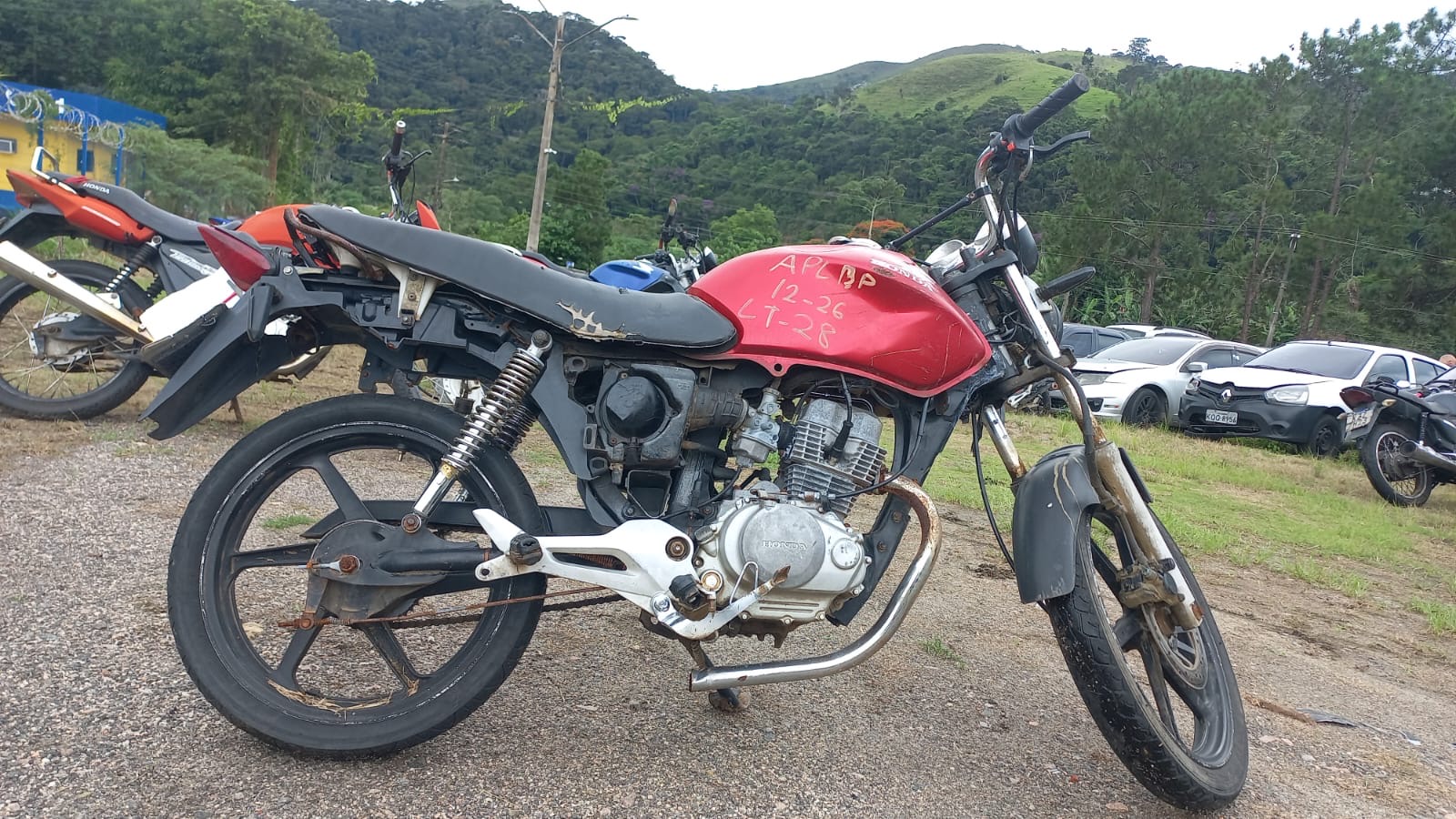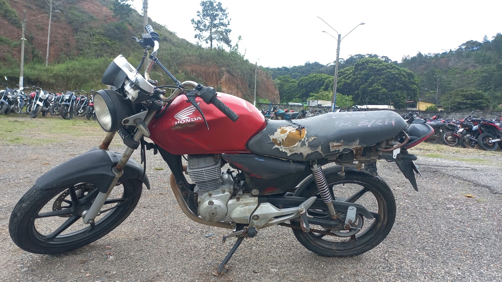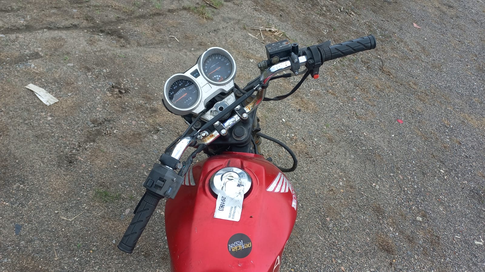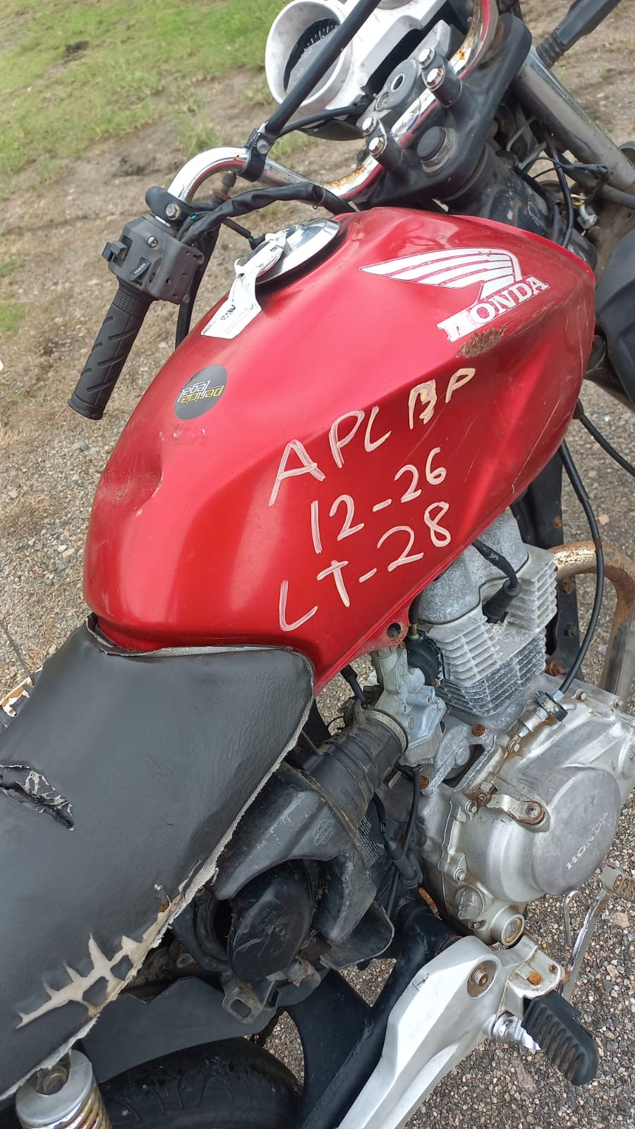 VEÍCULO COM PLACA DANIFICADA E INFORMAÇÕES DESGASTADAS. TANQUE AMASSADO. GRAVAÇÃO DO CHASSI COM INICIO DE OXIDAÇÃO. PEÇA SOLTA NO QUADRO, ABAIXO DO TANQUE. REGULARIZAÇÃO POR CONTA DO ARREMATANTE.