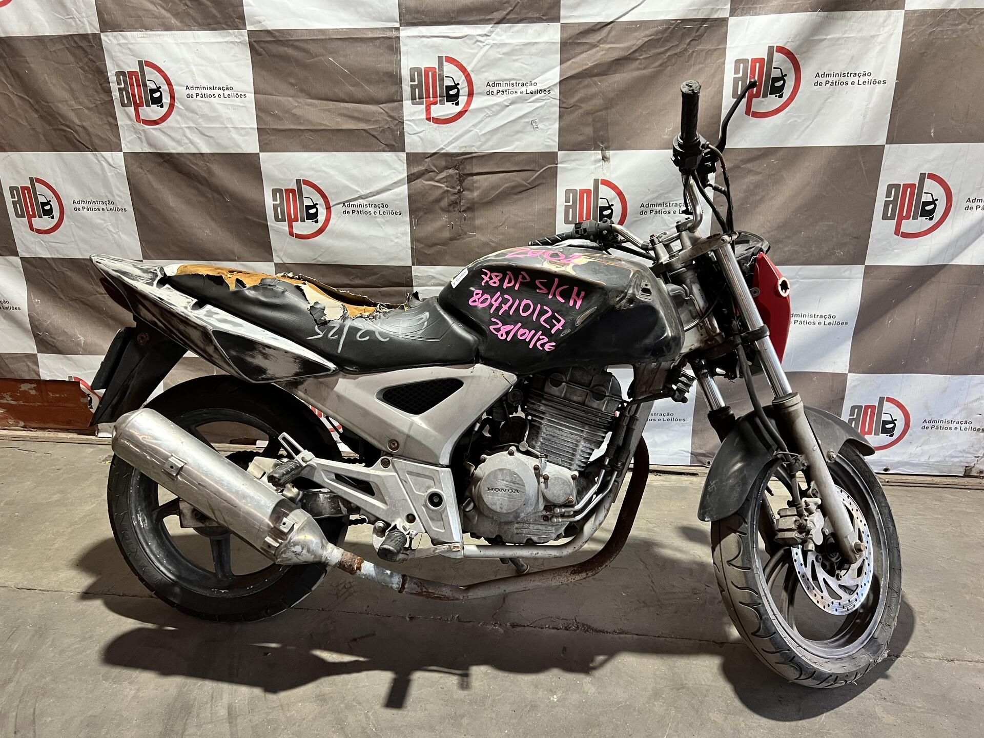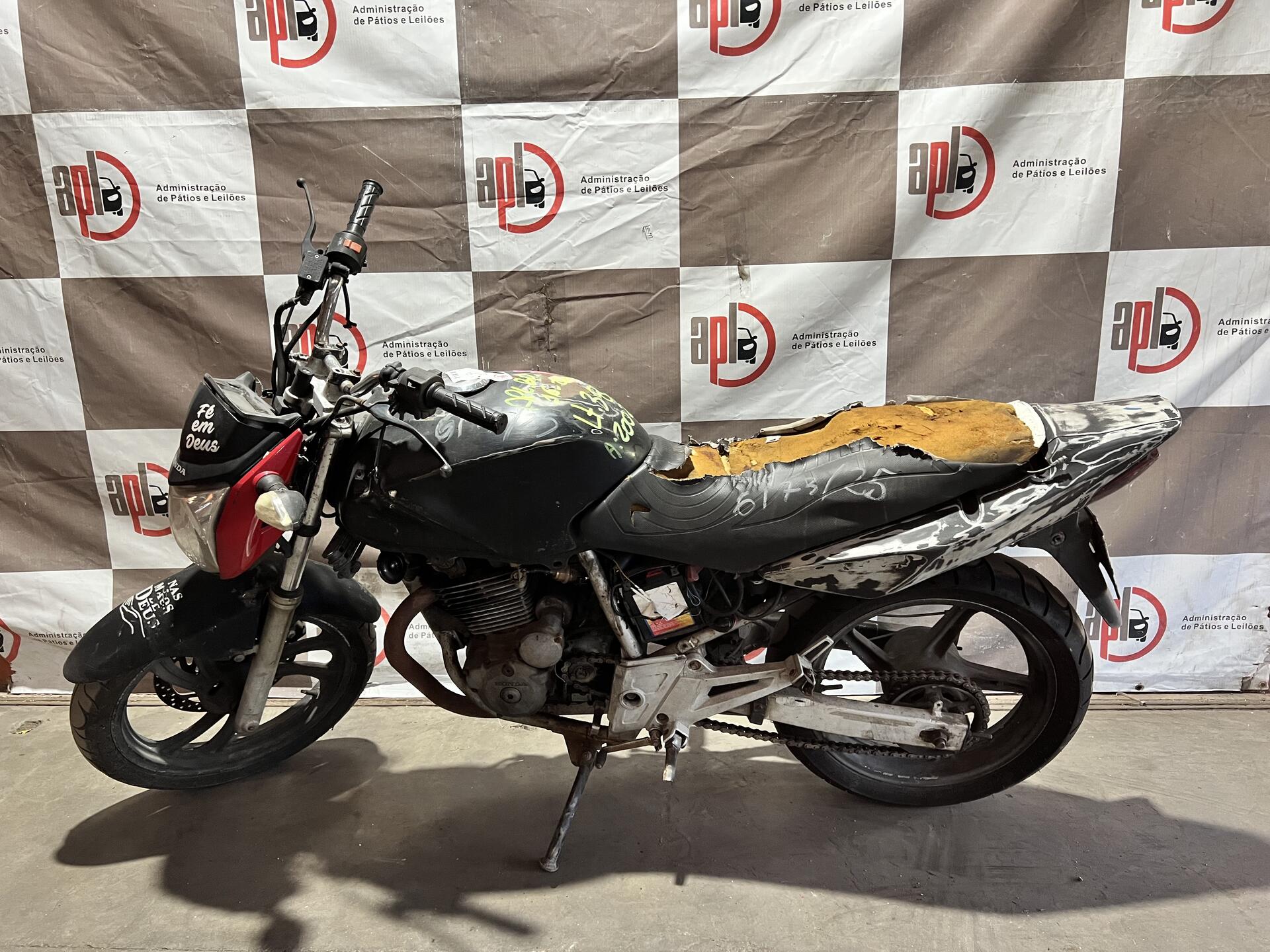 VEÍCULO COM AVARIAS NAS CARENAGENS E BANCO. PARTE FRONTAL DANIFICADA. RETROVISORES AUSENTES. REGULARIZAÇÃO POR CONTA DO ARREMATANTE.