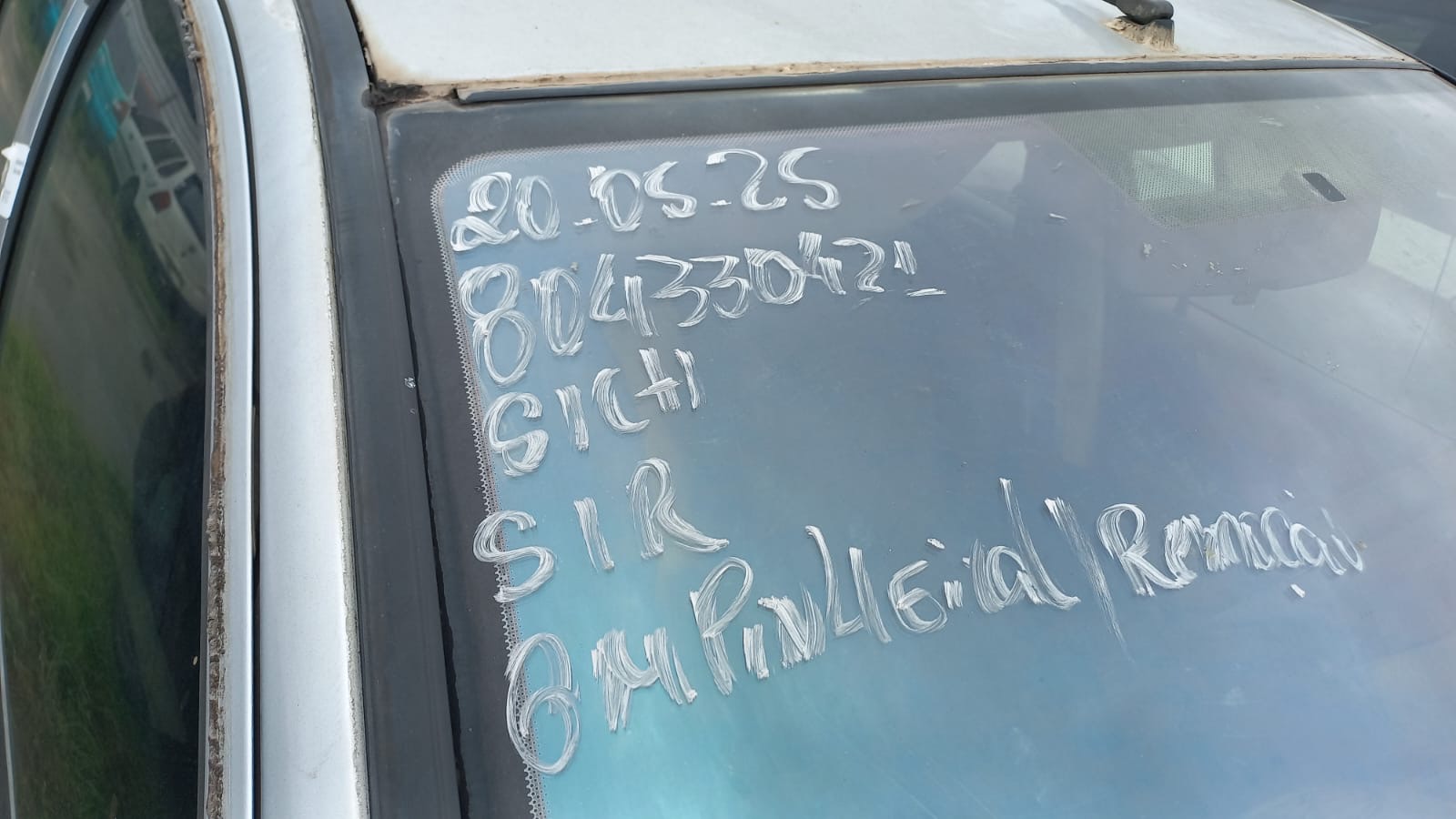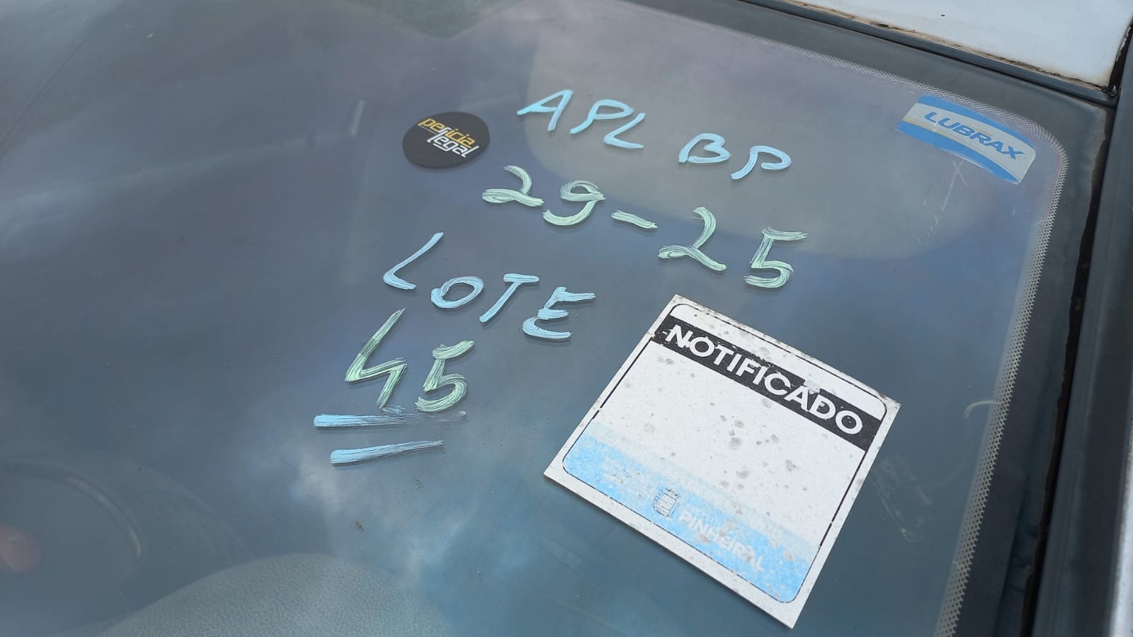 VEÍCULO COM PARA-BRISA SEM GRAVAÇÃO. PARA-LAMA DIANTEIRO LADO ESQUERDO AMASSADO.